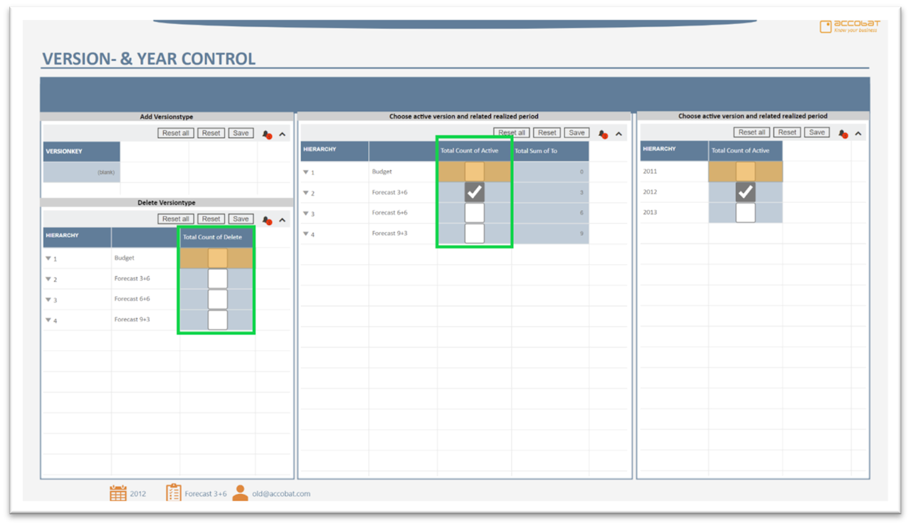 In the following, an example will be shown where a checkbox will be applied in a planning version dimension (Budget, Forecast 3+9, Forecast 6+6, etc.). The case is to define which planning type is the active one and thereby the one that should be forecasted on, furthermore, we have a component where it is possible to remove a certain planning version from the selection.