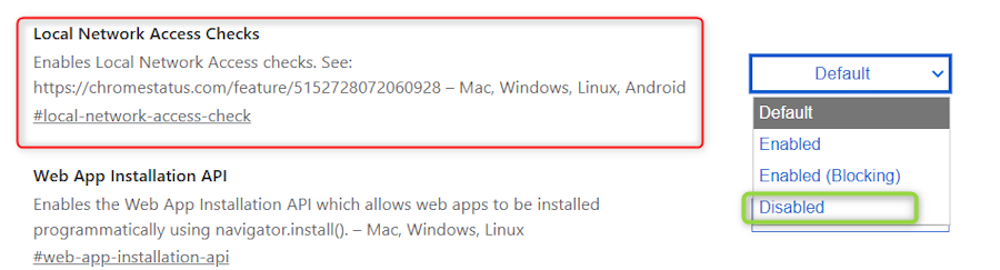 Scroll down the list until you find the option Local Network Access Checks.Change the Setting