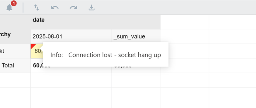"Error encountered - all changes canceled Unexpected end of JSON input" ![]() | Often a result of a wrong connection information for the writeback database/tabel in accoMASTERSDATA. | Revisit your connection information in the connection tab of the formating area of the visual. (Server Name, database Name, Username, password, schema, Writeback tabel name) Try to reenter the information and/or try to connect to the database and table though Microsoft Management studio to verify if the connection information is valid |